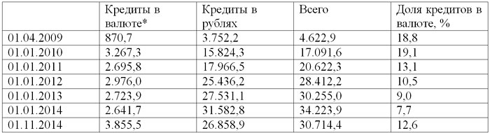 Как видно из табл. 1, доля валютных кредитов в общем объеме банковских кредитов весной 2009 года, когда появились первые признаки выхода из финансового кризиса 2008-2009 гг., была близка к 1/5. В 2011 году «долларизация» кредитных операций российских банков начала снижаться, этот процесс продолжался до начала 2014 года. А вот в 2014 году опять началось достаточно резкое повышение доли валютных кредитов в общем объеме кредитов российских банков юридическим лицам-резидентам и индивидуальным предпринимателям.