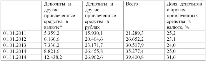 Из табл. 2 видно, что в период 2011-2013 гг. доля депозитов и других привлеченных средств в общем объеме привлеченных средств банков России находилась примерно на одном уровне (около ¼). А к концу прошлого года (по состоянию на 1 декабря 2014 года) она резко подскочила вверх. Таким образом, по пассивным операциям мы также видим усиление долларизации банковского сектора России.