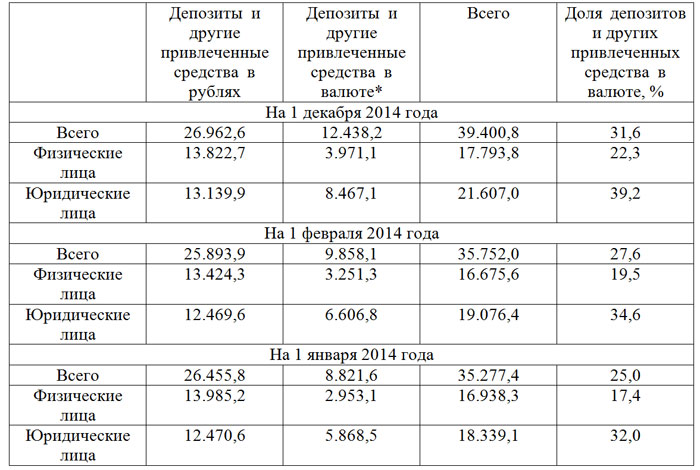 Зачем черное выдавать за белое? Или министр рассчитывает, что инвесторы и прочие граждане, как резиденты и нерезиденты не пользуются статистикой? Еще раз обратимся к статистике Банка России (табл. 3). Из нее следует, что в феврале 2014 года доля валюты в общем объеме привлеченных российскими банками средств составила 27,6% против 25,0% в январе. При этом по физическим лицам показатель вырос с 17,4 до 19,5%, а по физическим лицам – с 32,0 до 34,6%. Кстати, на начало декабря 2014 года доля валюты по физическим лицам уже выросла до 22,3%. А по юридическим лицам она выросла до 39,2%.