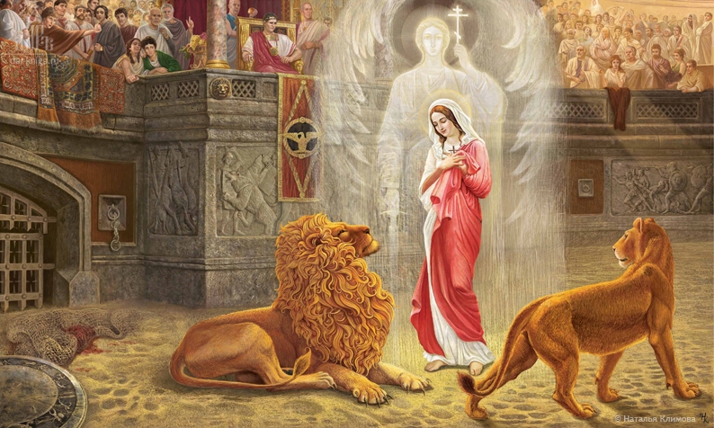 На утро святую Татиану привели в цирк [11] и выпустили на нее страшного льва, чтобы он растерзал святую. Но свирепое животное не коснулось святой. Лев ласкался к ней и покорно лизал ей ноги. Когда же льва хотели было увести обратно из театра в клетку, он внезапно устремился на одного знатного сановника, по имени Евмения, и растерзал его.