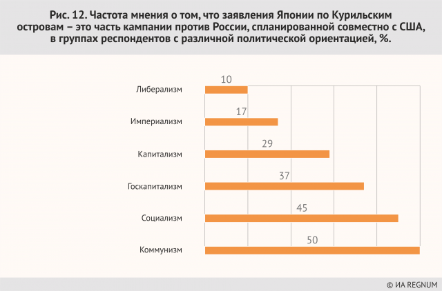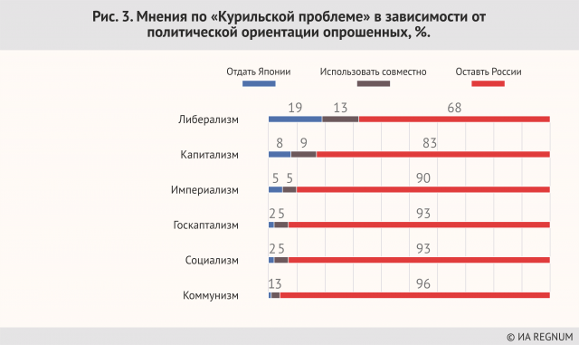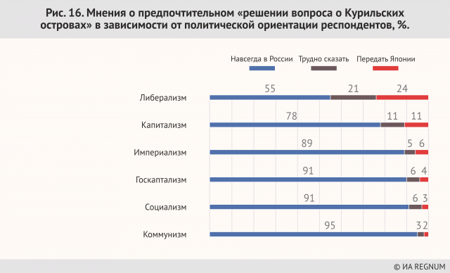Можно прямо отметить, что идеологическая принадлежность к сторонникам либерализма и капитализма диктует доминирование в этой среде именно коммерческих аргументов, аргументов сиюминутной материальной выгоды (то есть гипотетической, ожидаемой выгоды в результате торговли территорией своей страны). Эта, прямо говоря, продажность затрагивает наименее зрелые и опытные слои населения, молодёжь. И если, повторим, правящая идеологическая монополия либерализма в России сохранится, то Курильские острова будут проданы Японии за гипотетические и сиюминутные материальные выгоды, игнорирующие все ценности, на которых ещё стоит Россия как независимое государство. Больше половины граждан России считают, что главная проблема Курильских островов — это ее нерешенность (!). МИДу надо задуматься. Действия официальных лиц России, лавирование в этом вопросе — начатое еще Горбачевым и чуть не оформленное Ельциным, явственно показывают гражданам их согласие с тем, что «проблема Курил» якобы не решена. Поскольку действия Ельцина на «курильском направлении» не получили открытой отрицательной оценки — и наоборот, фигура Ельцина является элементом поклонения в специально построенном для этого культовом здании — то и подход Ельцина к территориальной целостности России россияне считают продолжающимся. Несмотря на грозную риторику. Поэтому принадлежность Курильских островов и урегулирование российско-японских отношений документально могут быть решенными, но поскольку ельцинизм как явление не пережит, постольку этот вопрос и не считается закрытым. Кстати, как в России, так и в Японии.