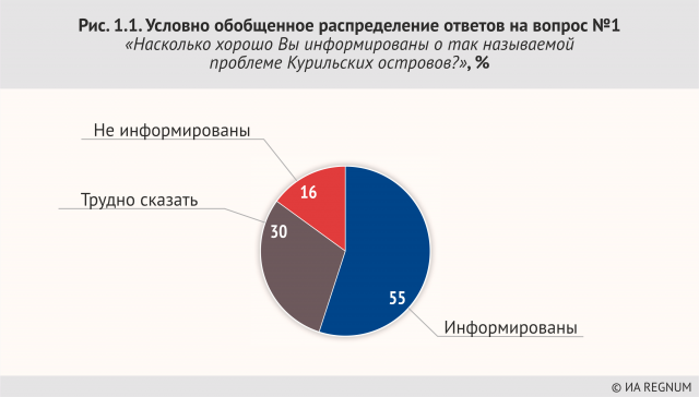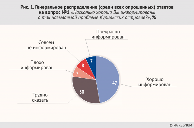 Нынешний опрос ИА REGNUM призван выяснить уровень информированности и мнение россиян по вопросу Курильской гряды. Что волнует сейчас граждан больше — позиция России на международной арене или реакция на нее условного Запада? Как видят будущее Курил люди в зависимости от возраста или политических предпочтений? Ответы на эти и многие другие вопросы удалось получить в ходе опроса, посвященного этой самой восточной территории России. Если собрать в разной степени информированных и в разной степени неинформированных вместе, то будет такая картина: Можно констатировать, что большинство жителей России хорошо представляет себе «Курильскую проблему»: всего 16% ответили, что информированы плохо. Однако, как говорится, «до хорошо еще далеко»: по всей видимости, достаточной информации по вопросу не имеет почти никто — только 7% граждан считают, что они «прекрасно информированы», все остальные похвастаться такой информированностью не смогли, а значит, они чувствуют некоторую недостаточность своих знаний. Это означает на самом деле, что невнятная позиция СМИ по вопросу о Курилах приводит к недостаточному освещению проблемы, а в результате — к недостаточной информированности людей.