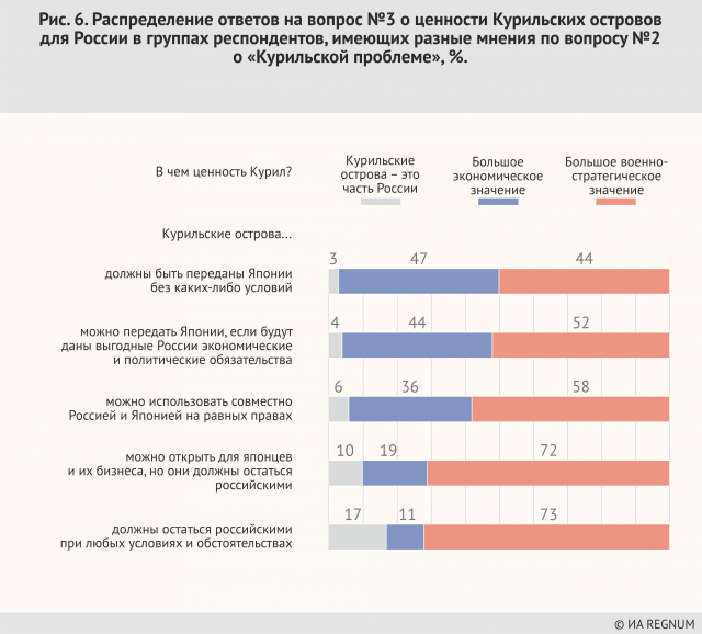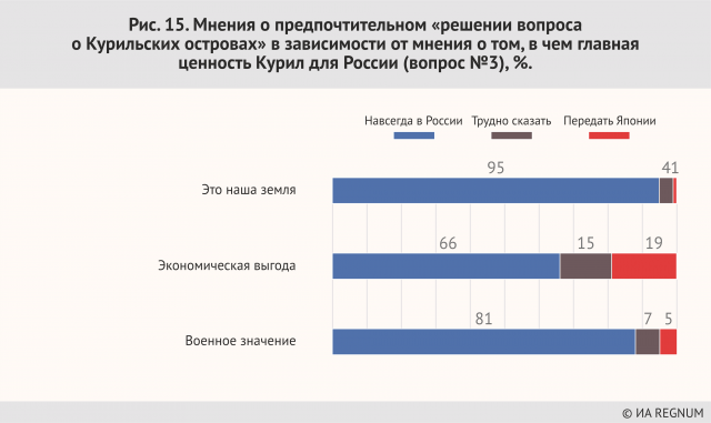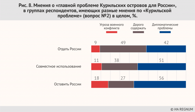 Характерно, что те, кто считает возможным передачу островов Японии, меньше всего опасаются возможных конфликтов, включая военные, за острова, для них наиболее частый аргумент — это дороговизна содержания островов. Возможно, она же — главный драйвер их решения о передаче Курильских островов Японии: действительно, зачем их содержать, если это дорого? — пусть у японцев голова болит.