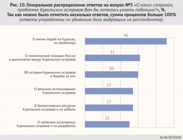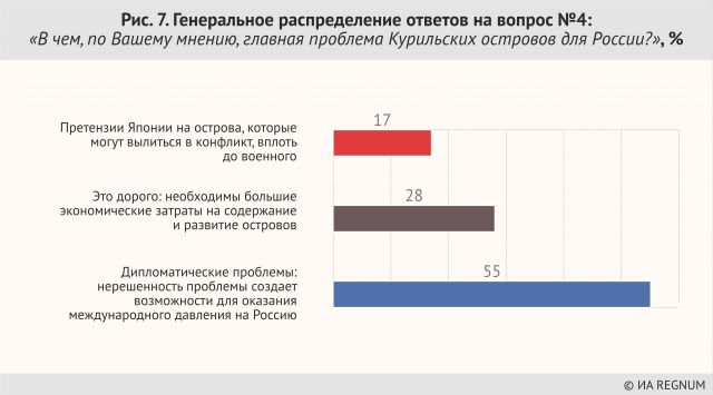 Максимальное число граждан отметило военно-стратегическое значение Курил — иными словами, более двух третей россиян живут в ожидании войны (ответы на дальнейшие вопросы до некоторое степени это подтверждают). Государственная пропаганда работает по нескольким направлениям, но отклик вызывают далеко не все. Россию, несмотря на все успехи в Сирии, граждане воспринимают как страну, находящуюся под угрозой. Возможно, работает мощнейшая аналогия, полученная на примере Крыма, ведь основным пропагандистским приемом (кроме воли местного населения, которая работает не везде — в Крыму да, в Донбассе нет) является то, что Крым «выхватили прямо под носом» у американского десанта.