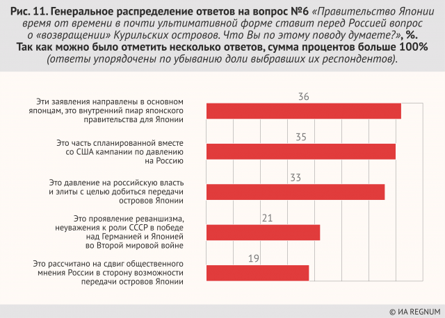 Что же касается тех граждан, которые считают, острова — российские и должны таковыми остаться (а таких, напомним, подавляющее большинство), то их больше всего волнует дипломатическая «нерешенность» проблемы, и 18% из них (почти пятая часть) озабочена возможными конфликтами за острова. Если бы это был не опрос ИА REGNUM, а референдум (читатели должны понимать, что в случае с референдумом по таким же вопросам, распределения бы отличались от полученных в нашем опросе не сильно, максимум на 3—5 пунктов по основным вопросам), то он бы означал буквально требование граждан России к руководству — хватит вилять и намекать, скажите уже, наконец, прямо: Курильские острова никогда не будут переданы Японии — ни при каких обстоятельствах, ни в каком виде. Интересно, что угроза конфликтов с Японией из-за островов волнует в основном молодых граждан (возможно, потому, что в случае военного конфликта именно им придется в нем участвовать), а «нерешенность» проблемы островов волнует тем больше, чем старше респонденты. В опросе ИА REGNUM выявлена существенный интерес граждан России к информации о Курилах. Граждане (почти треть), естественно, хотят больше знать о дипломатии вокруг Курил — раз уж проблема «не решена». И почти половина российских граждан хочет знать больше о жизни своих соотечественников на Курильских островах. В отношении постоянных заявлений и требований Японии «вернуть» острова граждане России чаще всего успокаивают себя тем, что эти заявления в основном направлены внутрь Японии, а не России. Но почти так же часто они думают, что эти заявления — часть кампании против России, спланированной совместно с США, и, что особенно неприятно, что эти заявления адресованы российской власти и элитам — с целью добиться всё же передачи островов Японии. И реже всего граждане России верят в то, что эти заявления могут вызвать сдвиг общественного мнения в России в сторону возможности передачи островов Японии. Суммируя эти тезисы — веру в давление на элиту и неверие в то, что это давление изменит позицию народа — можно сделать напрашивающиеся выводы. Что Япония и США надеются за некоторые преференции изменить точку зрения элит, как считают российские граждане. И следующий — вероятно, граждане допускают, что такая японско-американская операция против российских элит имеет шансы оказаться удачной. При этом в твердости своей позиции россияне не сомневаются — а вот международный сговор вполне допускают. Вполне закономерными являются и ответы на главный вопрос опроса ИА REGNUM. При всей очевидности воли большинства граждан России по этому вопросу очень важно понимать, что на мнение тут влияют несколько факторов.