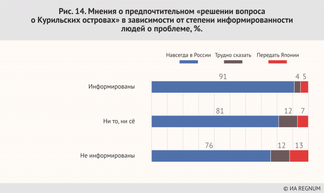 Зависимость от уровня информированности — чем больше информирован, тем больше патриотичен — тоже представляет определенную сложность. Как доносить определенную точку зрения об интересах России до людей, которым Россия не интересна? Это еще одна характерная черта политики имени Горбачева и Ельцина, которые вводили Россию в сообщество «цивилизованных» (!) стран. Россия, очевидно, свернувшая с этого пути, для его приверженцев, очевидно, не является цивилизованной страной и как таковая не может обладать своим мнением. Как это все будет сочетаться с патриотическим воспитанием, о котором последнее время идет так много разговоров? Патриотическое воспитание невозможно без верной оценки событий перестройки, потому что возникающее противоречие между оценками официальной и очевидной в случае этих 8% всегда будет решаться в сторону антироссийскости. Да и с остальными не всё так гладко — если вспомнить, что более половины граждан (включая вполне патриотичных) считают «курильский вопрос» до сих пор не решенным.
