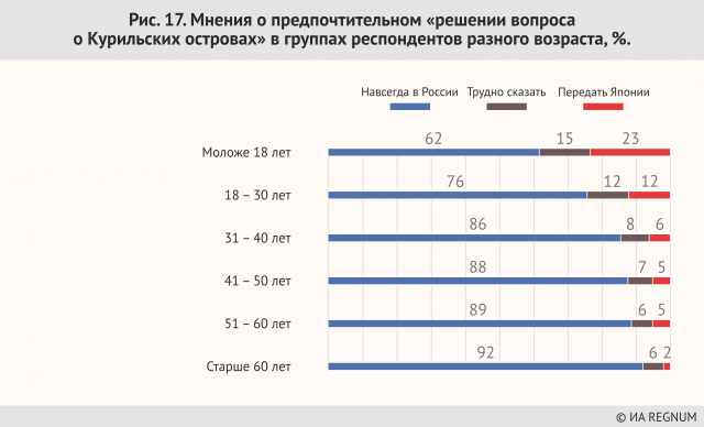 А поскольку российская молодежь, согласно официальной политике образования, воспитывается также в либеральном духе, то и среди молодежи склонность к антироссийской, по существу, позиции почти так же часто проявляется, как и у людей либеральной политической ориентации. Можно предположить, что при сохранении существующей властной монополии либералов на управление системой образования и большинством СМИ уже через 20—25 лет доля тех, кто готов отдать Курилы Японии или поделить с ней свой суверенитет над островами может вполне оказаться равной 50% или даже претендовать на простое большинство. Но пока (пока либералы не промыли мозги всему населению) большинство граждан даже не допускают мысли, что Курилы можно кому-нибудь отдать. Почему? Как обосновывается эта позиция? Большинство наших соотечественников обосновывают для себя невозможность отдавать Курилы их военным значением. Типа «не отдадим, потому что наша безопасность будет под угрозой». 17% граждан обосновывают свое решение«экономической выгодой» Курил для России. И только 13% говорит прямо, что это Курилы — русская земля и такой останется, независимо от экономической или военной ситуации. Тут есть о чём подумать.