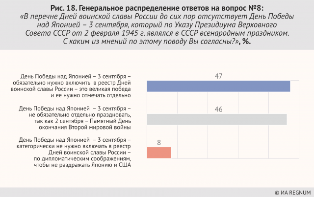 Почти столько же граждан — 46% — считает, что включать в реестр 3 сентября как День победы над Японией не обязательно, так как накануне — 2 сентября — празднуется День окончания Второй мировой войны.