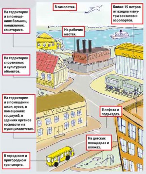 Закон Российской Федерации от 23 февраля 2013г. № 15-ФЗ «Об охране здоровья граждан от воздействия окружающего табачного дыма и последствий потребления табака» запрещает курение в большинстве зданий и на отдельных территориях и предусматривает штрафы как с курильщиков, так и с юридических лиц, прямо или косвенно ответственных за то, что человек закурил не там, где следует.