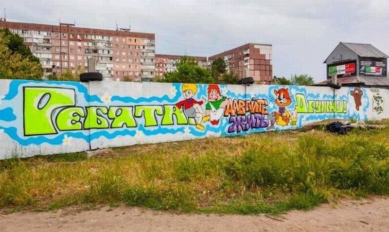 Один из руководителей детской спортивной организации «Честь и вера» Роман Горяинов подтвердил: «Мы закрасили то, что перед этим было нарисовано неизвестными нам парнями… Наша организация наблюдала за происходящими здесь действиями. За две недели до Дня Великой Победы неизвестные лица обрисовали стену. Нарисовали «Дивизия Галичина». Что возмутило местных жителей, на почве этого возник конфликт и перерос в драку, уже с участием полиции. Мы с единомышленниками пообщались. Решили создать рисунок…» 13 мая замысел был воплощён в жизнь. Теперь на громадной стене герои любимых детских мультфильмов – Чебурашка и Крокодил Гена, Малыш и Карлсон – объединены лозунгом Кота Леопольда: «Ребята, давайте жить дружно». Это, разумеется, не призыв дружить с нацистами, такое невозможно. Это предупреждение. Больных, инфицированных нацизмом, нужно лечить. Рецептов немного, но они есть. Хуже с врачами. Нацизм - это рана на теле Украины, которая затянется, если к власти придут те, кто не будут рану расчёсывать.