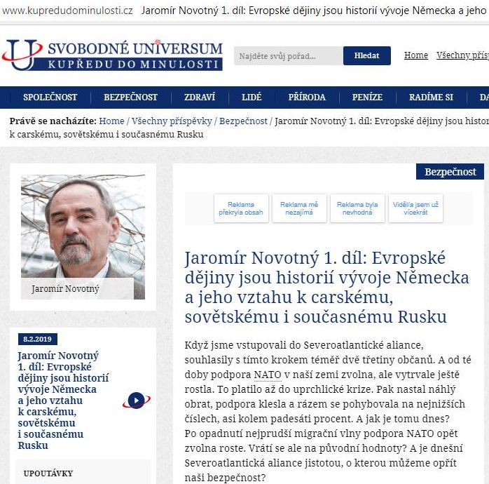 Тематика интервью была приурочена к 20-летию вступления Чехии в военный блок НАТО. Можно одним словом выразить мнение дипломата о Североатлантическом блоке – разочарование. Новотны надеялся на то, что Чехия, вступив в НАТО, получит безопасность и защитится от России: