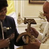 Точно так же и современные папы Римские – это просто политические дельцы на ниве умирающего христианства Запада. Они ассоциируют себя не с последними верующими постхристианского Евросоюза, а являются частью финансово-политической верхушки Евросоюза и США. Кстати сказать, я не зря привел аналогию с коммунизмом, ведь папа Франциск на сегодня занял именно ту нишу, которую в Европе ранее занимали неокоммунисты и леваки-«экологисты». Он недавно даже с благодарностью принял от левацкого президента Боливии Моралеса в подарок кощунственное «Распятие» в виде … серпа и молота (см. фото).