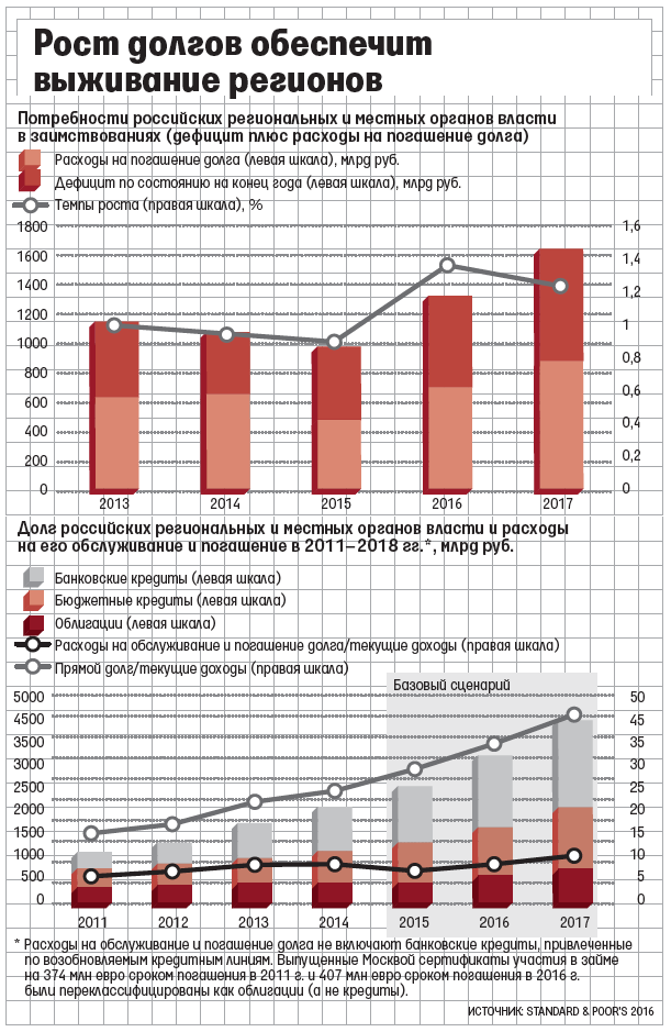 Займы регионов в 2017 г. могут достичь 1,7 трлн руб., расходы на погашение – 860 млрд, прогнозируют аналитики S&P. Рост доходов замедлится до 4–5%, а рост расходов из-за предстоящих выборов может разогнаться до уровня инфляции. Дефицит увеличится с 3% совокупных доходов в 2015 г. до 8% в 2017 г.