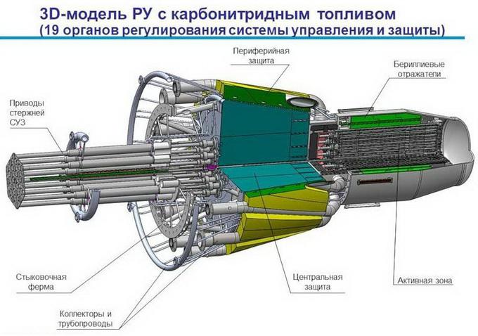 - Ядерно-энергетической установки с газотурбинной схемой преобразования энергии, ЭРДУ на основе ионных электроракетных двигателей и ЯЭРДУ в целом – ГНЦ «Исследовательский центр им. М. В. Келдыша», который является также ответственной организацией по программе разработки транспортно-энергетического модуля (ТЭМ) в целом.