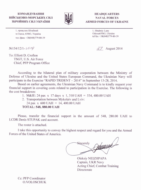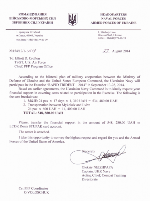 Один из самых удивительных документов. Командование Военно-морских сил нижайше просит заокеанских хозяев оплатить командировочные расходы украинских офицеров во время учений, проводимых Пентагоном на украинской же территории. А где же национальная гордость? К тому же зачем перечислять более полумиллиона гривен на карточный счет капитана 3-го ранга Дениса Ступака – объяснить невозможно. Разве что с целью использовать бесконтрольно, скрыть от налогов, лично обогатиться? Вероятно, украинским и американским журналистам будет интересно найти этого офицера и задать ему ряд вопросов.