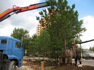 Озеленение осуществлялось специализированной фирмой, а деревья привозились из питомника, который расположен недалеко от районного центра. Растения районированы, выращены в наших климатических условиях и приспособлены к ним. Сосны привозились партиями по 5 штук и тут же, с использованием автомобильного крана, высаживались в заранее вырытые приямки. Затем осуществлялся рейс за следующей партией зелёных насаждений. Перед посадкой почва удобрялась, а по высадке – поливалась.