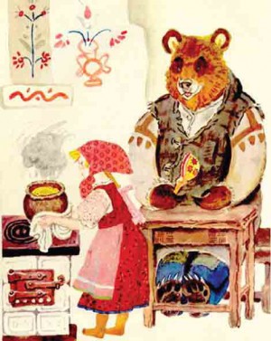 „Кто же здесь живёт? Почему никого не видно?.." А в той избушке жил большущий медведь. Только его тогда дома не было: он по лесу ходил. Вернулся вечером медведь, увидел Машеньку, обрадовался.