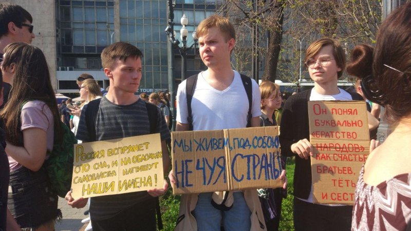 Памятник Пушкину активисты НОД оцепили лентой георгиевских цветов, символом своего движения. По другую сторону островка оцепления остались приглашенные Навальным, из которых не все готовы видеть блогера во власти. Трое студентов, стоявших с цитатами Пушкина (Россия вспрянет ото сна), Мандельштама (Мы живем, под собою не чувствуя страны) и Маяковского (Он понял буквально «братство народов»), сказали, что выступают за сменяемость власти. Во главе государства они хотели бы видеть «человека, у которого есть программа». Правда, пока людей в России нет.