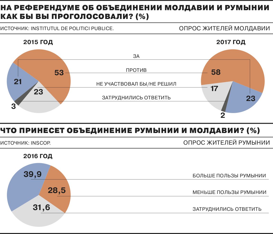 Согласно опросу кишиневского Institutul Politici Publice, в апреле 2017 года объединение с Румынией поддерживали 23% жителей страны. Другой молдавский исследовательский центр — IMAS — в декабре прошлого года сообщил, что на гипотетическом референдуме об объединении с Румынией за проголосовали бы 32% граждан Молдавии. В республике себя свободно чувствуют многочисленные унионистские организации и зарегистрированы партии, программной целью которых является вхождение в состав соседней страны. На постсоветском пространстве, да и во всей Европе не найти государства, в котором наблюдалось бы нечто подобное.