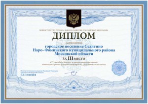 Диплом был вручен на торжественном мероприятии в Государственной Думе 20 апреля 2013 года, в котором приняли участие Глава городского поселения Селятино Голубев Е. Н. и Глава Наро-Фоминского муниципального района Баранов А. Н.Селятинцы, гордитесь: наше городское поселение вошло в тройку лучших среди 736 поселений Российской Федерации!
