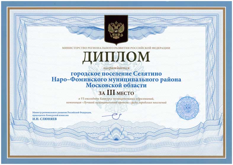 Диплом VI ежегодного Конкурса муниципальных образований в номинации «Лучший муниципальный проект», врученный городскому поселению Селятино за III-е место среди городских поселений Российской Федерации.