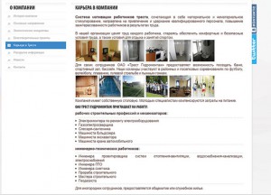 Раздел сайта «Карьера в тресте» посвящен кадровым вопросам. На сегодняшний день число сотрудников группы компаний составляет 326 человек, количество вакантных мест – 28. Наши двери открыты для молодых специалистов. Для иногородних сотрудников ОАО «Трест Гидромонтаж» предлагает благоустроенное общежитие, для ценных специалистов рассматривается вопрос служебного жилья. После работы имеется возможность посещать спортивный зал, бассейн, баню. Молодым специалистам компенсируются затраты на питание.