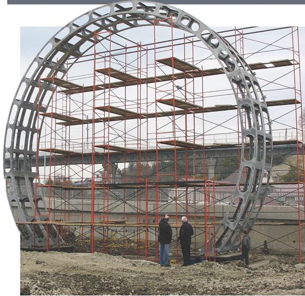 Всё - как всегда. Конструкторское бюро (главный конструктор - Владимир Константинович Миценко) разрабатывает проект. Специалисты делают расчёт несущих способностей, учитывая большое число факторов. Ведущий проектировщик Игорь Сергеевич Фоменко показывает на мониторах (впервые увидела рабочий стол компьютера, которому мало места на двух больших экранах) макет и рабочие чертежи, фотографии, сделанные в цехе завода и на месте во время монтажа. Оказывается, на заводе проводилось по две контрольных сборки каждой конструкции. Чтобы иметь полную гарантию, что никаких нестыковок не произойдёт. Ведь сборку колец по монтажной схеме ОЗГ выполняла фирма-заказчик - ООО «ГрандПроектСити». Селятинцы дали точность в долях миллиметра, при том, что каркас каждой дуги состоит из восьми секций и весит почти десять тонн! Она имеет высоту 13 метров, а её диаметр превышает 15 с половиной метров. После установки каркас облицевали разноцветными стальными листами, и теперь кольца выглядят так: внутри они окрашены в традиционные олимпийские цвета - синий, жёлтый, красный, чёрный и зелёный, а снаружи на русском и английском языках читаются названия пяти континентов Земли.