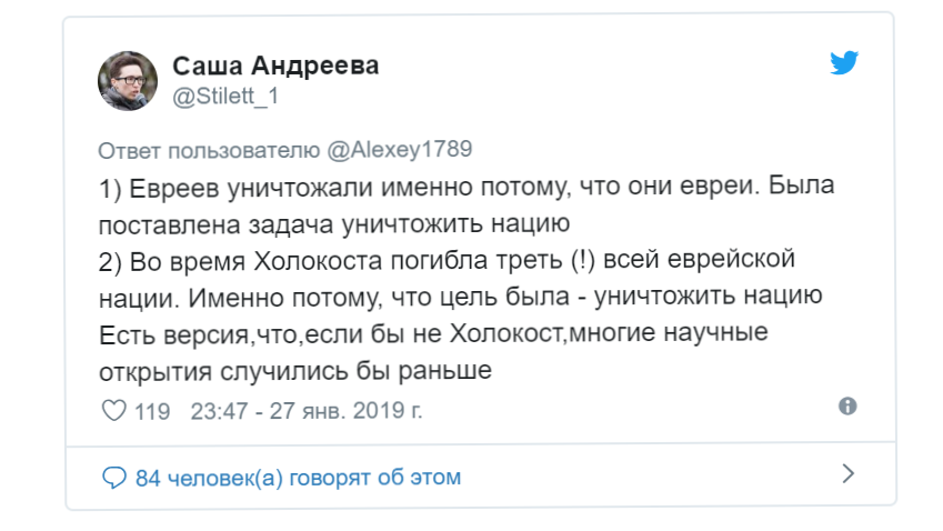 "Славяне уничтожались не с целью уничтожить нацию. А с целью освободить землю. Евреи — с целью уничтожить нацию. Понимаете разницу?"Неприкрытая русофобия, издевательство над памятью Великой Отечественной войны, плевок в сторону жертвы и подвига нашего народа. Какие люди в первую очередь ассоциируются у вас с такими поступками? Либералы с оппозиционных радиостанций? Оголтелые нацисты? Возможно. Но сегодня такими вещами в открытую занимаются депутаты КПРФ. В частности, пламенная Александра Андреева из московского района Лефортово. Здесь можно почитать, как бойко она спорит с историками, считающими, что жизнь и смерть людей всех национальностей имеют одну и ту же ценность:ту же ценность: