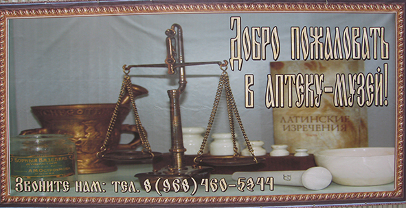 Конечно, оформление музея – это сложный и трудоемкий процесс. Только профессиональный подход и знание маркетинговых стратегий организации аптеки способно объединить аптечные и музейные отделы в единый механизм, а посещение ее сделать не только полезным в плане покупок, но интересным и познавательным. Несмотря на то, что цель посещения аптеки – покупка лекарств, каждый клиент обращает внимание на интерьер и детальное устройство торгового зала. И нам не всё равно, какое мнение останется о нас у наших покупателей. И нам кажется интересным и беспроигрышным вариантом в оформлении торгового зала аптеки, если в этом же зале будет открыт специальный музейный отдел с соответствующими атрибутами, такими как стилизованная мебель и экспозиция необычных экземпляров медицинских товаров и книг, рассказывающих о развитии фармации в России.