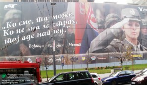 В левом корпусе ясно видны следы попадания нескольких авиабомб и крылатых ракет. На руинах такого же 10-этажного правого корпуса на другой стороне улицы натянут огромнейший плакат, на котором фотография военнослужащих армии Сербии и слова воеводы Живоина Мишича, национального героя сербского народа, участника Балканских и Первой мировой воин: «Кто может, тот должен. Кто не знает страха, тот должен идти вперед».