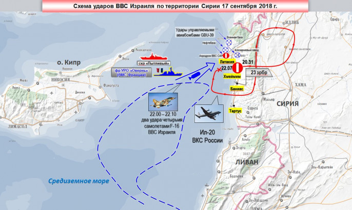 "Семнадцатого сентября около 22:00 часов четыре F-16 Военно-воздушных сил Израиля нанесли удар управляемыми авиационными бомбами по сирийским объектам в районе города Латакия. Заход на цели осуществлялся на малой высоте со стороны Средиземного моря. При этом израильские самолеты преднамеренно создали опасную ситуацию для надводных кораблей и воздушных судов, находящихся в этом районе. Бомбометание выполнялось недалеко от места нахождения французского фрегата «Auvergne» и в непосредственной близости от заходившего на посадку самолёта Ил-20 ВКС России. Прикрываясь российским самолётом, израильские лётчики подставили его под огонь средств ПВО Сирии. В результате Ил-20, у которого эффективная отражающая поверхность на порядок больше чем у F-16, был сбит ракетой комплекса С-200. Израильские средства управления авиацией и лётчики F-16 не могли не видеть российский самолёт, так как он в это время заходил на посадку с высоты пяти километров. Тем не менее, они преднамеренно пошли на эту провокацию. О планируемой операции Израиль командование российской группировки войск в Сирии не предупреждал. По «горячей линии» уведомление поступило менее чем за одну минуту до удара, что не позволило вывести российский самолёт в безопасную зону. В настоящее время поисково-спасательная операция в районе крушения Ил-20 продолжается. Расцениваем данные провокационные действия Израиля как враждебные. В результате безответственных действий израильских военных погибло 15 российских военнослужащих. Это абсолютно не отвечает духу российско-израильского партнерства. Мы оставляем за собой право на адекватные ответные действия", - сообщил генерал Конашенков.