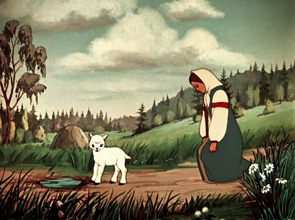 Зовет Алёнушка братца, а вместо Иванушки бежит за ней беленький козлёночек. Залилась Алёнушка слезами, села на стожок - плачет, а козлёночек возле неё скачет.