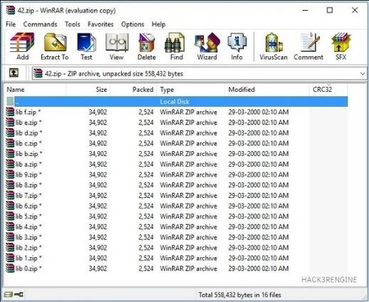 Первая файловая бомба при сжатии весит всего 42 КБ (килобайта), а после разархивации ее объем увеличивается до 5,5 ГБ. Здесь вся опасность кроется именно в повышенной нагрузке на процессор, так как 5,5 свободных гигабайтов в 2019 г. есть практически на любом компьютере.