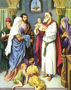 Иисус, как и положено младенцам, мирно спал на руках Матери. Но проснулся, когда к Святому семейству подошёл старик, взял Его на руки и сказал странную и непонятную фразу: «Ныне отпускаешь раба Твоего, Владыко, по слову Твоему, с миром, ибо видели очи мои спасение Твоё, которое Ты уготовал пред лицем всех народов, свет к просвещению язычников и славу народа Твоего Израиля» (Лк.2:29-32).