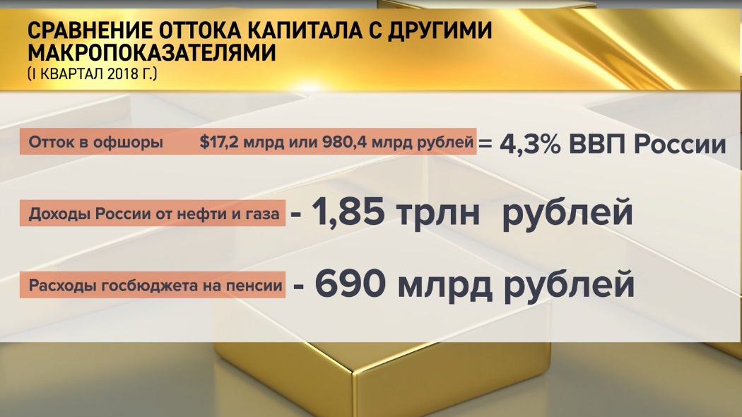 Правда, факт жизни несколько иной. Только по итогам первого квартала 2018 года в офшоры из нашей страны было выведено более $17,2 млрд, что в 6,3 раза больше, чем за предыдущий аналогичный период.