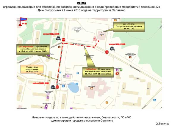 Уважаемые жители городского поселения Селятино! Администрация городского поселения Селятино уведомляет, что 21 июня 2013 года в связи с чествованием выпускников школ 2013 года, обеспечением безопасности детей и подростков, жителей, принимающих участие в праздничном мероприятии, будет ограничено движение автомобильного транспорта: