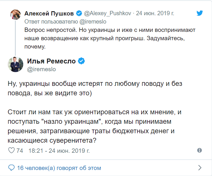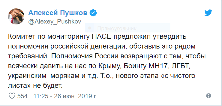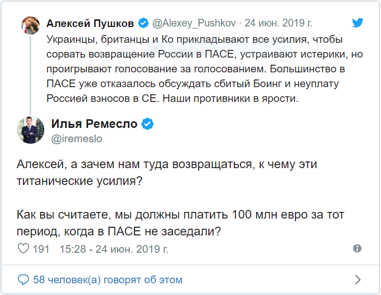 25 июня ряд журналистов и "ТВ-экспертов" выражали радость в соцсетях по поводу новости о возвращении России в ПАСЕ, сопровождая посты насмешками над украинцами. Доводилось видеть даже такой аргумент: "раз украинцы злятся, значит, это неспроста, мы одержали великую победу".