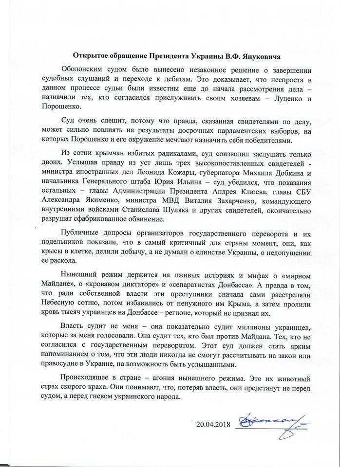 Янукович написал открытое письмо к украинским властям (23.04.2018)
