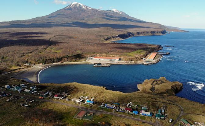 На фото: вид на бухту Олю и вулкан Богдан Хмельницкий на острове Итуруп — остров южной группы Большой гряды Курильских островов, принадлежность которого оспаривает Япония, рассматривая его территорию как часть субпрефектуры Нэмуро префектуры Хоккайдо (Фото: Сергей Красноухов/ТАСС)