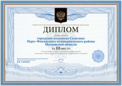 Диплом VI ежегодного Конкурса муниципальных образований в номинации «Лучший муниципальный проект», врученный городскому поселению Селятино за III-е место среди городских поселений Российской Федерации....