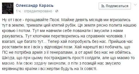 Мы свою задачу выполнили, а уйти с позиций нас заставило руководство страны, и все жертвы будут на их совести», — добавил Карась.