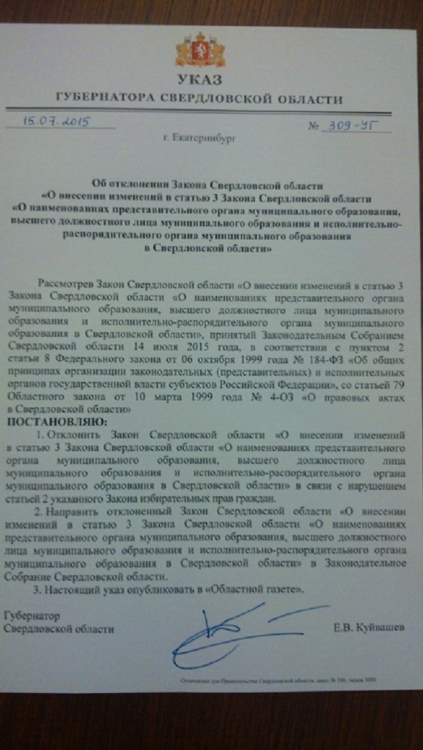 Свердловский губернатор Евгений Куйвашев отменил решение законодательного собрания региона о ликвидации должности главы города (15.07.2015)