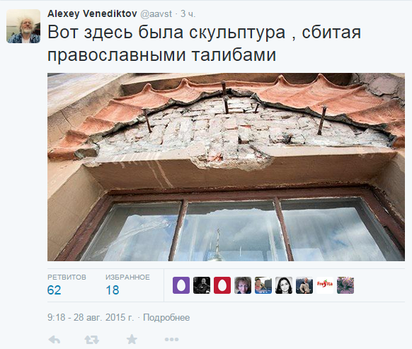 Давно стало ясно, что бесстыдство и хамство российских антиклерикалов не знает границ. Примечательно, что в российском сегменте Тwitter появились сотни одинаковых постов от сомнительных аккаунтов на тему инцидента с разрушением барельефа. Остальная лента сообщений этих «реальных пользователей» абсолютно идентична. На волне антиклерикальных настроений либеральные СМИ поспешили подбавить масла в разожженный антирелигиозный огонь. Издательство Павла Гусева утром опубликовало статью с издевательским заголовком «РПЦ проведёт обряд изгнания импорта из магазинов».