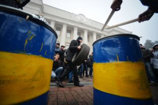 Толпа выкрикивает «ИМПИЧМЕНТ» в адрес действующего президента Порошенко. Депутаты заблокированы в здании Рады.