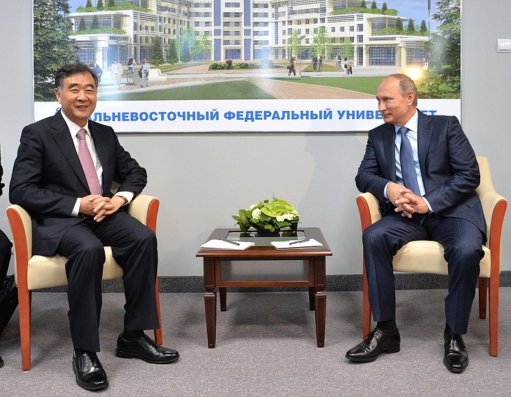 Состоялась краткая беседа Владимира Путина с вице-премьером Государственного совета Китайской Народной Республики Ван Яном, представляющим Китай на Восточном экономическом форуме во Владивостоке.