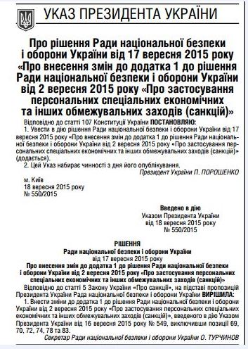 Во вторник ночью были обнародованы указы президента Украины Петра Порошенко о решениях Совета национальной безопасности и обороны Украины ''О применении персональных специальных экономических и других ограничительных мер (санкций)» и о внесении изменений к его дополнению.