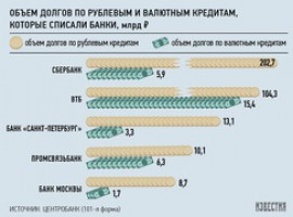 В итоге объем рублевых долгов, списанных банками за 12 месяцев до 1 сентября 2015 года, вырос за год на 43,5% до 603 млрд, валютных — на 35,4%, до $912 млн (с учетом пересчета курса доллара на упомянутые даты). За предыдущий аналогичный период банки списали долгов на 445 млрд рублей.