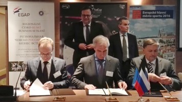Губернатор Сергей Морозов, гендиректор чешской компании «Тримилл» Милан Юлина и гендиректор Корпорации развития региона Сергей Васин подписали договор о намерениях строительства в Ульяновской области завода по производству сверхскоростных обрабатывающих центров.