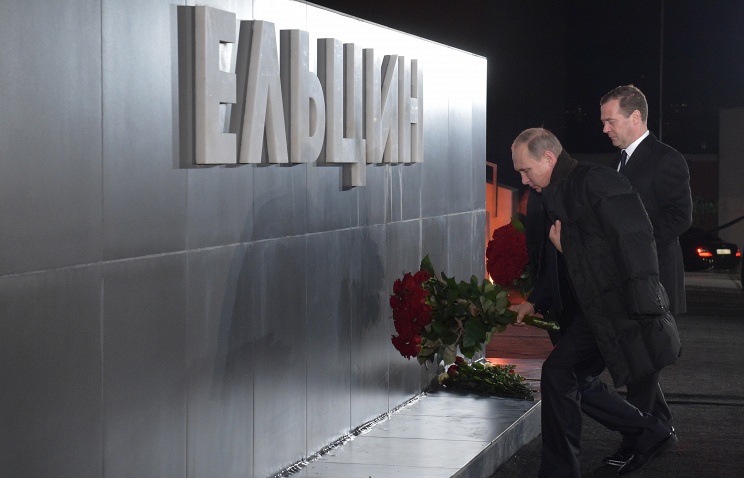 Президент России Владимир Путин и премьер-министр Дмитрий Медведев возложили цветы к памятнику первому российскому президенту Борису Ельцину, установленному у президентского центра Бориса Ельцина ("Ельцин центр").
