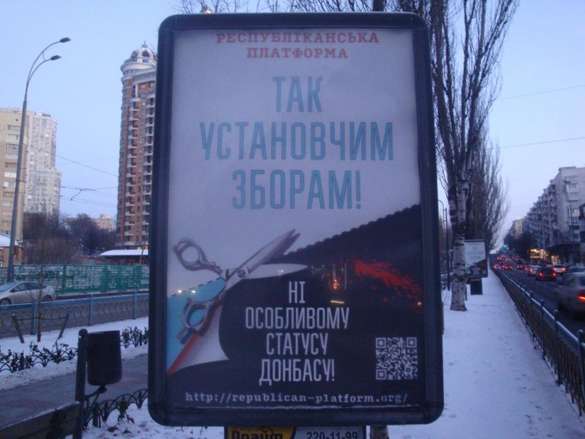 Накануне возможного голосования в Верховной Раде по пунктам Минских соглашений, предусматривающих предоставление особого статуса для Донецка и Луганска, в Киеве появились рекламные плакаты против автономии Донбасса.